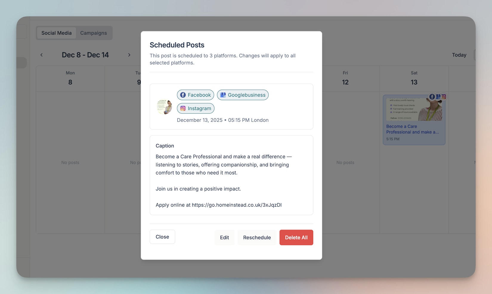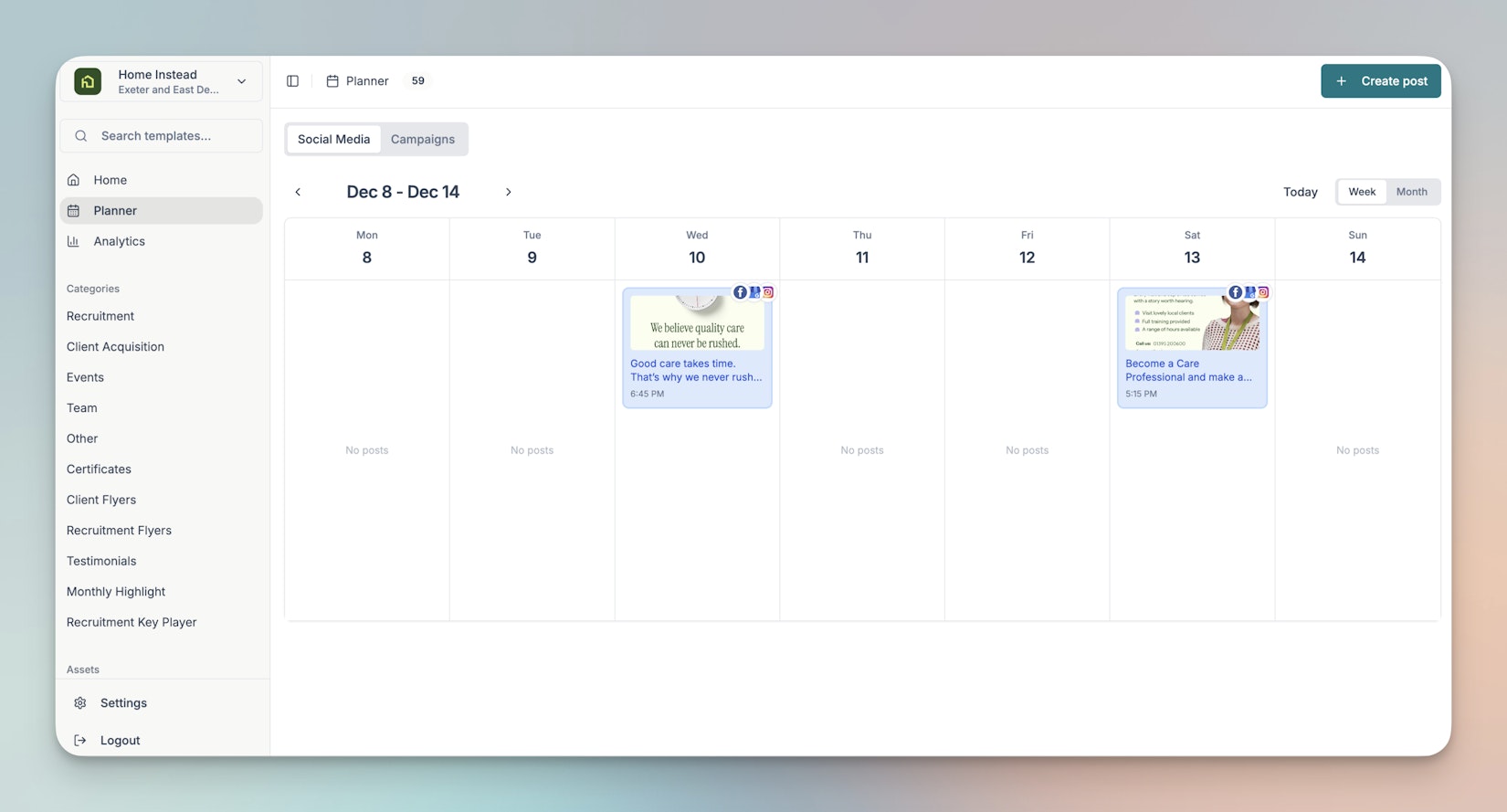 Select Create Post in the planner to upload a photo or video, write a caption and choose the accounts you want to publish to.